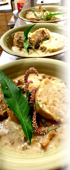 mit Semmelknödel, Bio-Kartoffel und Bio-Speckkrautsalat