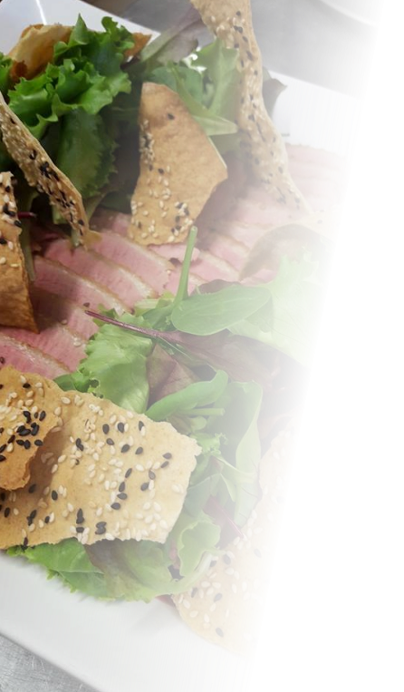 in Sesampanier mit Kartoffelmayonnaisesalat